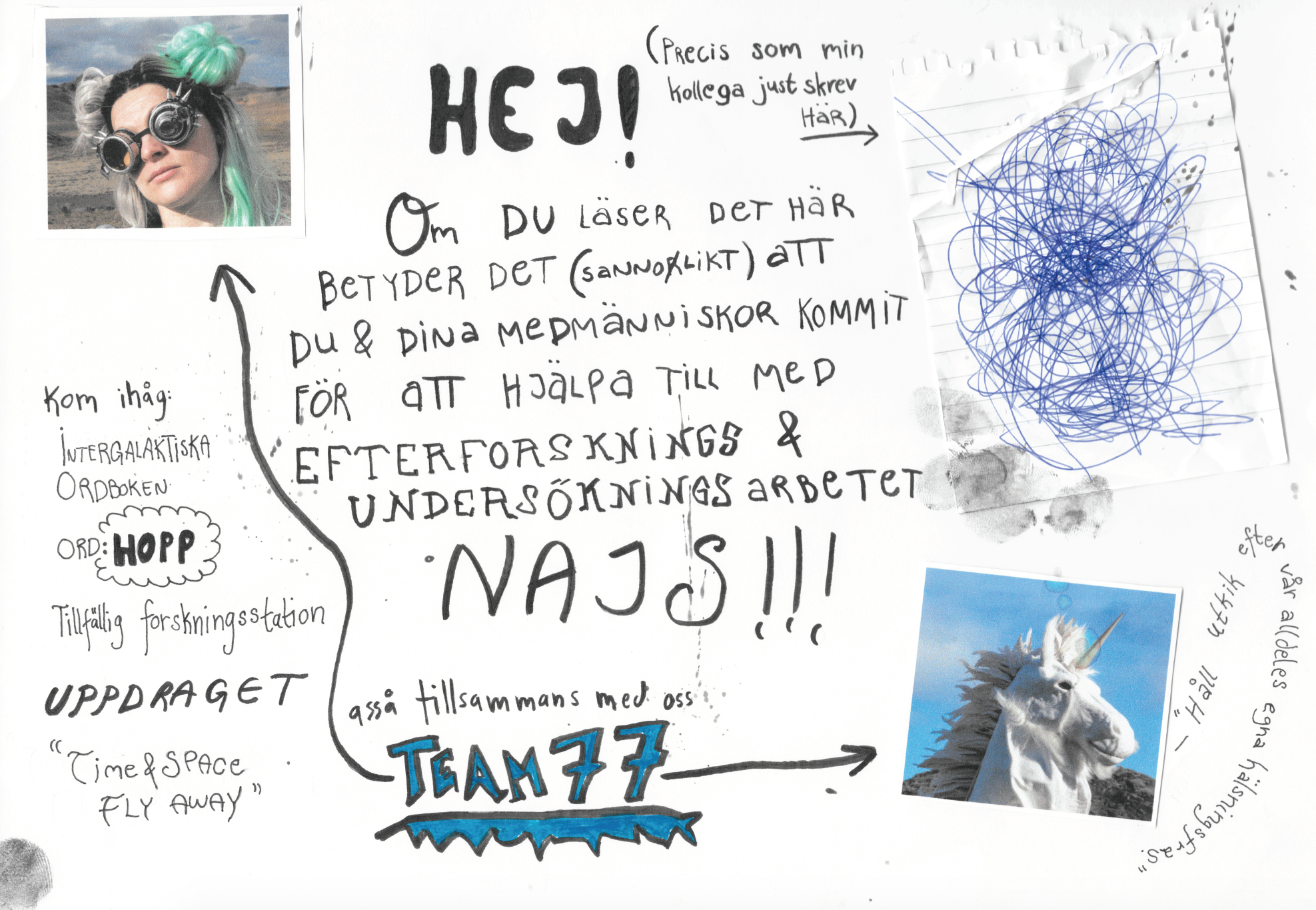Innan vi besöker skolan skickar vi ut en lärarhandledning med för- och efterarbete som är kopplat till föreställningen. Vi skickar även med meddelandet nedan från de intergalaktiska tidsresenärerna!